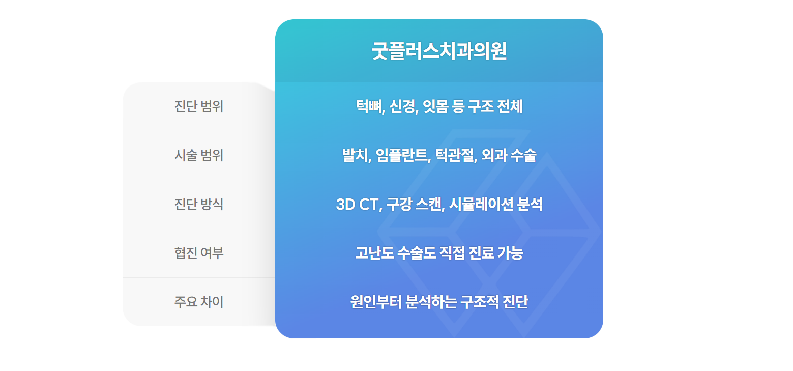 | 초보 체크 | ① 내 증상-치료 매칭 ② 검사(영상/사진)로 설명 ③ 치료 단계/기간 안내 ④ 치료 후 관리 계획 |